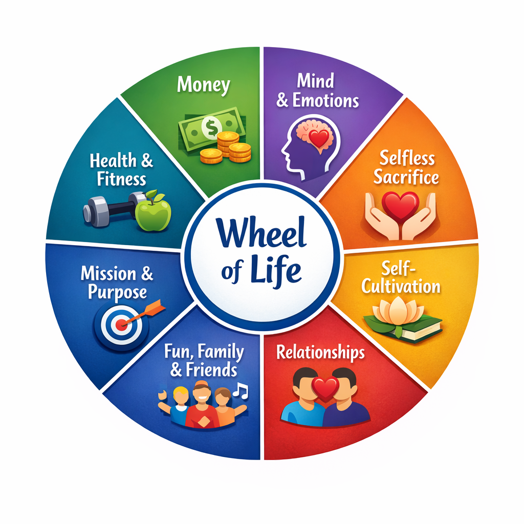The 8 key areas of growth in one’s life are; Mind & Emotions | Contribution | Self-Cultivation | Spirituality | Fun, Family & Friends | Mission and Purpose | Health & Fitness | Money. If you focus too much on one of these areas while neglecting the others, the integrity of your life as a whole will be adversely affected.